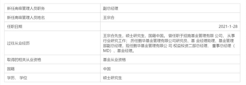值得一提的是,昨日晚間鵬華基金發(fā)布二則高級管理人員變更公告,公告顯示王宗合新任基金管理人副總經(jīng)理一職。
