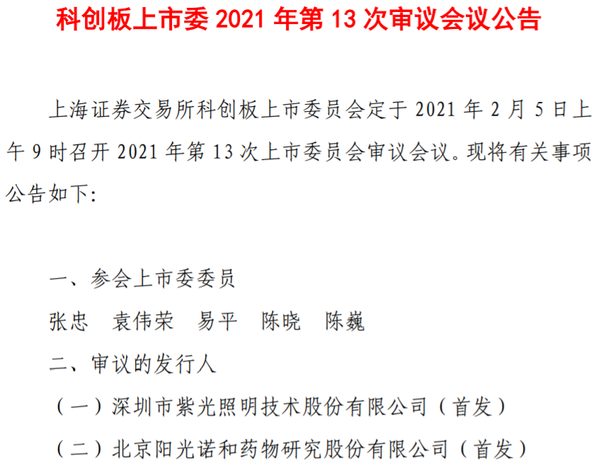 2月1日,了解到,上海證券交易所科創(chuàng)板上市委員會定于2021年2月5日召開2021年第13次、14次上市委員會審議會議。屆時,深圳市紫光照明技術(shù)股份有限公司(以下簡稱:紫光照明)、北京陽光諾和藥物研究股份有限公司(以下簡稱:陽光諾和)、江蘇金智教育信息股份有限公司(以下簡稱:金智教育)、正元地理信息集團股份有限公司(以下簡稱:正元地信)四家公司將上會接受審核。