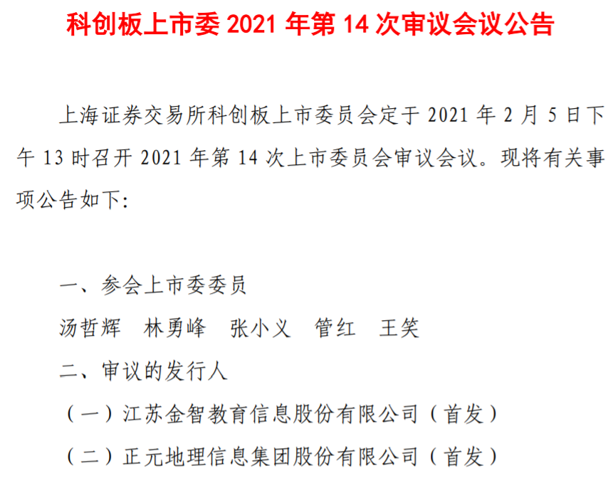 摘要: 2月1日,了解到,上海證券交易所科創(chuàng)板上市委員會定于2021年2月5日召開2021年第13次、14次上市委員會審議會議。