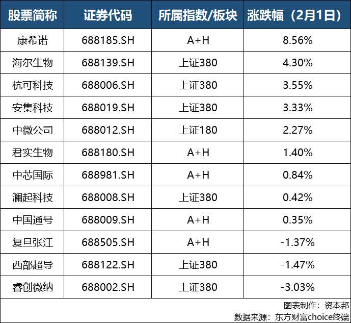 在上述12只符合條件的科創(chuàng)板個(gè)股中,截至2月1日收盤,僅有3只個(gè)股漲跌幅為負(fù),其他9只個(gè)股均有不同程度上漲。其中,【康希諾(688185)、股吧】2月1日收盤漲幅為8.56%。