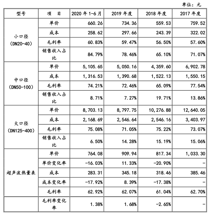 報告期各期,單位成本變動主要受安裝成本、細分口徑等因素所致。2017年度、2018年度、2019年度和2020年1-6月,熱量表安裝成本占銷售成本比例分別為21.80%、14.44%、17.25%、2.15%,變化趨勢與單位成本變化趨勢一致。