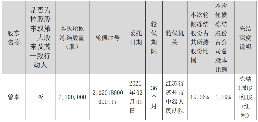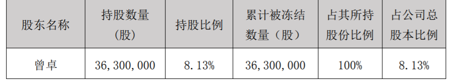 截至目前,曾卓持有公司3630萬股,持股比例為8.13%,累計(jì)被凍結(jié)3630萬股,占其所持股份100%。