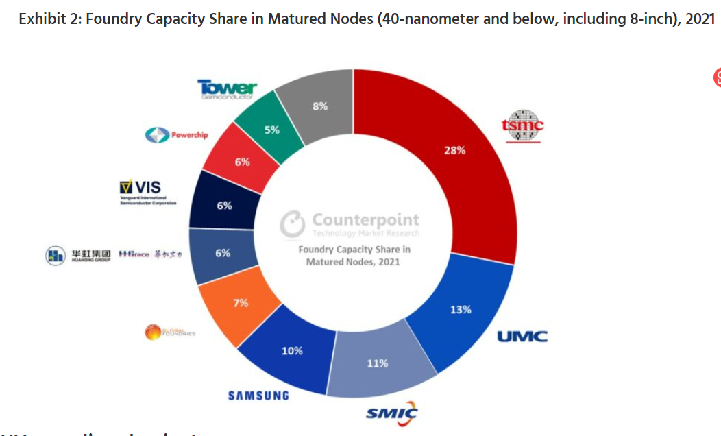 Research最新報(bào)告顯示,2021年全球半導(dǎo)體成熟制程(40納米及以下工藝節(jié)點(diǎn))市場(chǎng)中,臺(tái)積電將以28%的代工產(chǎn)能份額位居首位;其次是聯(lián)電,產(chǎn)能比重達(dá)13%;第三名是中芯國(guó)際,市場(chǎng)份額為11%;三星電子排名第四,份額為10%。