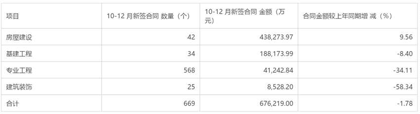 2月5日,了解到,寧波建工(601789.SH)及下屬子公司2020年10月至12月,新簽合同669個(gè),合同金額累計(jì)約人民幣67.62億元,較上年同期減少1.78%,具體情況如下: