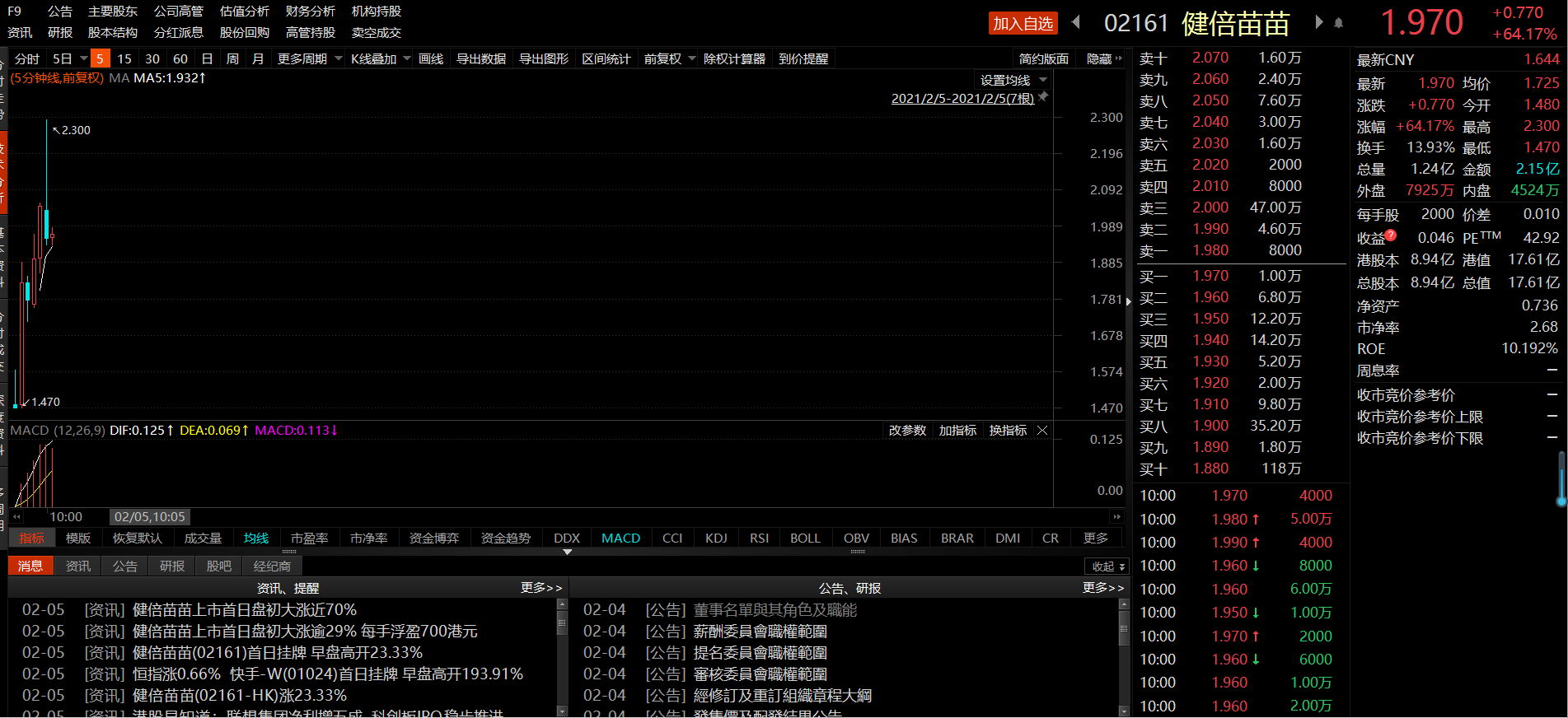 早盤健倍苗苗以1.48港元高開,較發(fā)行價1.2港元漲16.66%。截至10:00,健倍苗苗股價漲64.17%至1.97港元,換手率13.93%,成交量1.24億,總市值17.61億港元。