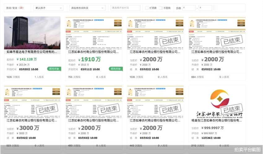 近幾個月來,阿里司法拍賣平臺上屢現(xiàn)如皋農(nóng)商行股權(quán)身影。2020年12月26日,該行剛有8筆股權(quán)拍賣結(jié)束,均以流拍告終。阿里司法拍賣平臺顯示,該行股權(quán)有19筆拍賣/變賣記錄,目前已拍賣結(jié)束的17場中,有2筆成交、1筆中止,其余流拍。