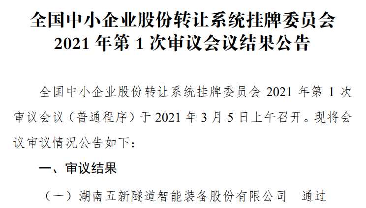 摘要 【控制權(quán)和經(jīng)營穩(wěn)定性存風險?五新隧裝2021年精選層首審過會】3月8日,資本邦了解到,全國中小企業(yè)股份轉(zhuǎn)讓系統(tǒng)掛牌委員會2021年第1次審議會議(普通程序)于2021年3月5日上午召開,會議審議通過了五新隧裝(835174.OC)精選層小IPO事項。 3月8日,資本邦了解到,全國中小企業(yè)股份轉(zhuǎn)讓系統(tǒng)掛牌委員會2021年第1次審議會議(普通程序)于2021年3月5日上午召開,會議審議通過了五新隧裝(835174.OC)精選層小IPO事項。