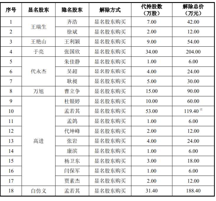 經(jīng)核查,高進、白仿義作為顯名股東,為隱名股東孟若其代持股數(shù)共計84.40萬股。根據(jù)孟若其的說明并經(jīng)保薦機構(gòu)、東利機械律師合理查驗,孟若其自持股數(shù)為24.40萬股,剩余60.00萬股系其為外部人員劉競超、秦改瑞等五位被代持人代持,具體情況列表如下: