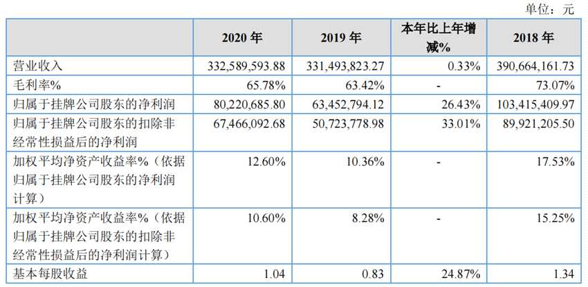 4月7日,永順生物披露年報顯示,公司2020年營業(yè)收入為3.33億元,同比增加0.33%,歸屬于掛牌公司股東的凈利潤為8022.07萬元,同比增加26.43%,每股收益為1.04元/股。