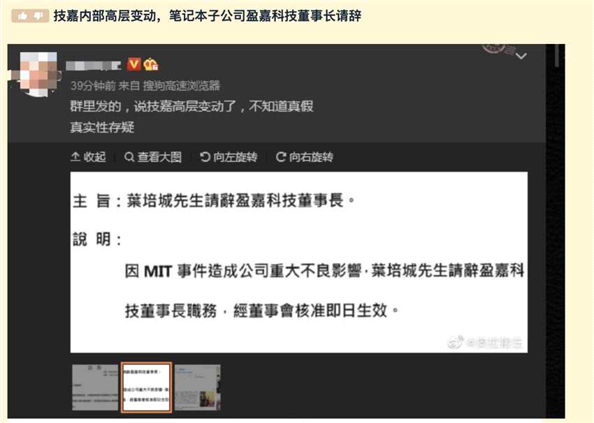 5月17日,“精英玩家俱樂部”論壇有網(wǎng)友發(fā)貼稱,“技嘉內(nèi)部高層變動(dòng),筆記本子公司盈嘉科技董事長請辭”。其發(fā)布了兩份文件截圖,并表示,“群里發(fā)的,說技嘉高層變動(dòng)了,不知道真假,真實(shí)性存疑。”