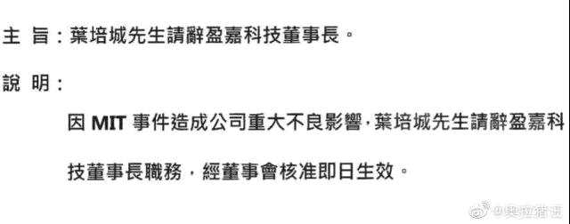 另一份文件主旨為“葉培城先生請辭盈嘉科技董事長”,說明稱,“因MIT事件造成公司重大不良影響,葉培城先生請辭盈嘉科技董事長職務(wù),經(jīng)董事會(huì)核準(zhǔn)即日生效。維基百科顯示,葉培城于1986年創(chuàng)辦技嘉科技,目前是技嘉科技股份有限公司、寶嘉聯(lián)合股份有限公司的創(chuàng)辦人暨董事長。