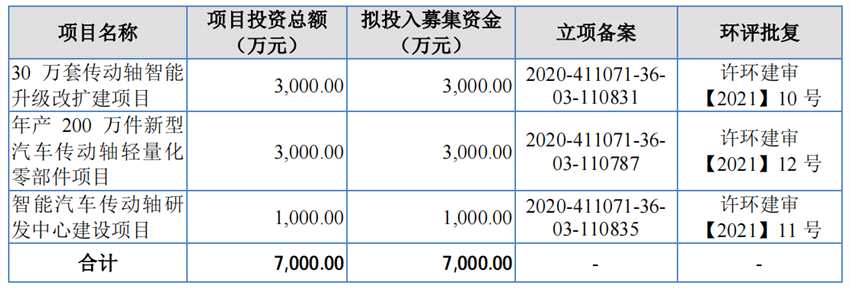 發(fā)行底價為3.95元/股,預(yù)計募集資金7000萬元。經(jīng)2021年3月4日公司第二屆董事會第十六次會議審議并經(jīng)2021年3月22日召開的2021年第二次臨時股東大會審議通過,募集資金將投用于公司30萬套傳動軸智能升級改擴建項目、年產(chǎn)200萬件新型汽車傳動軸輕量化零部件項目和智能汽車傳動軸研發(fā)中心建設(shè)項目,屆時將由董事會負責(zé)實施。