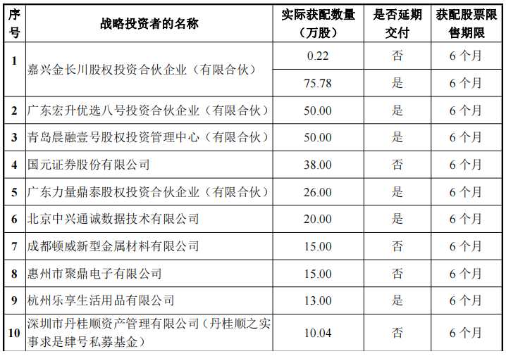 在戰(zhàn)略配售方面,德瑞鋰電本次發(fā)行最終戰(zhàn)略配售股份合計(jì)313.04萬股,占初始發(fā)行規(guī)模的20%(不含超額配售部分股票數(shù)量),戰(zhàn)略配售募集資金金額合計(jì)3027.10萬元。