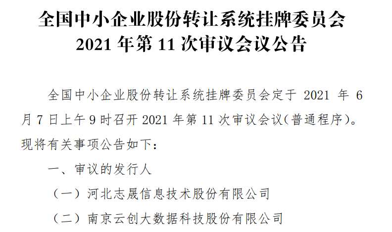 6月1日,全國中小企業(yè)股份轉(zhuǎn)讓系統(tǒng)掛牌委員會定于2021年6月7日上午9時召開2021年第11次審議會議(普通程序),屆時將審議志晟信息(832171.NQ)、云創(chuàng)數(shù)據(jù)(835305.OC)精選層小IPO申報事宜。