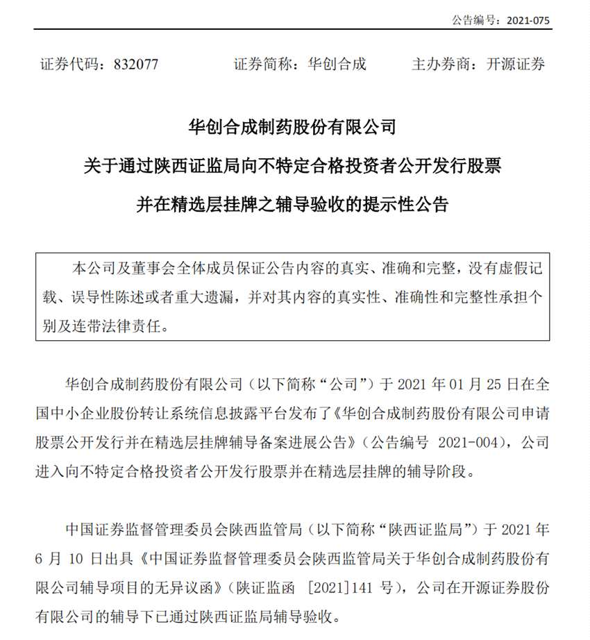 其中,華創(chuàng)合成于6月10日公告,已完成精選層輔導(dǎo)驗(yàn)收,輔導(dǎo)機(jī)構(gòu)為開源證券,公司在2021年1月25日正式進(jìn)入精選層輔導(dǎo)階段。華創(chuàng)合成專注于新藥研發(fā)及技術(shù)轉(zhuǎn)讓的醫(yī)藥研發(fā)高新技術(shù)企業(yè),研發(fā)范圍主要是創(chuàng)新藥及高品質(zhì)仿制藥的開發(fā)。創(chuàng)新藥的開發(fā)方向主要是小分子的創(chuàng)新藥,通過對藥物化學(xué)結(jié)構(gòu)的優(yōu)化修飾,自主研發(fā)藥效更強(qiáng)、安全性更高的化學(xué)新藥。華創(chuàng)合成全資購買制藥企業(yè)天地人和藥業(yè),完成進(jìn)一步向產(chǎn)業(yè)鏈下游的拓展,實(shí)現(xiàn)了由純研發(fā)企業(yè)向研、產(chǎn)、銷一體化醫(yī)藥集團(tuán)企業(yè)的戰(zhàn)略轉(zhuǎn)型。2020年,公司實(shí)現(xiàn)營業(yè)收入 8555萬元,同比增長 157.00%;實(shí)現(xiàn)凈利潤 3092萬元,同比增長175.86%。