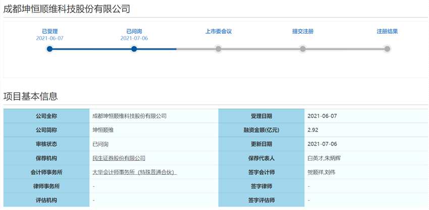7月7日,資本邦了解到,成都坤恒順維科技股份有限公司(下稱“坤恒順維”)科創(chuàng)板IPO進入“已問詢”狀態(tài)。