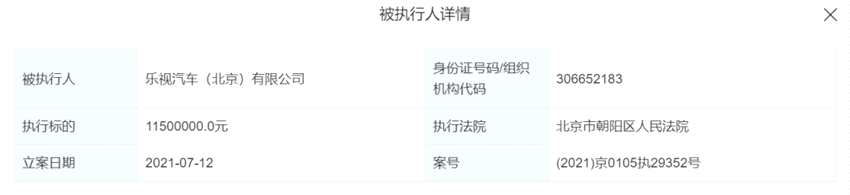天眼查顯示,7月12日,樂視汽車(北京)有限公司新增兩條被執(zhí)行人信息,執(zhí)行法院均為北京市朝陽區(qū)人民法院,執(zhí)行標(biāo)的總額為3000萬元。