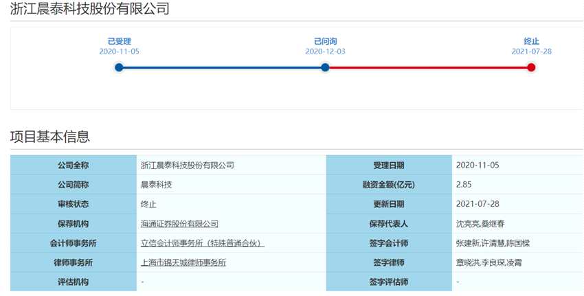 在回復(fù)了科創(chuàng)板二輪問(wèn)詢后,晨泰科技于2021年7月28日撤回發(fā)行上市申請(qǐng)或者保薦人撤銷保薦,終止科創(chuàng)板IPO審核。