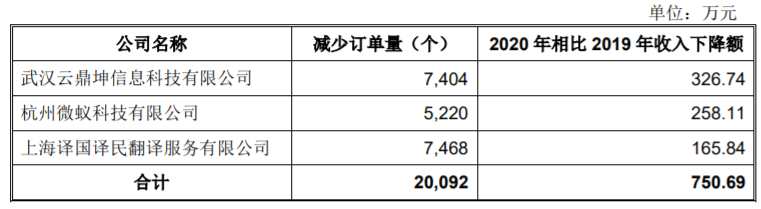 上述3家客戶2020年相比2019年收入下降總額750.69萬(wàn)元,均為筆譯業(yè)務(wù),涉及減少訂單量20,092個(gè)。上述3家客戶在報(bào)告期涉及的服務(wù)語(yǔ)種分布情況參見(jiàn)前文“(一)報(bào)告期內(nèi)大客戶模式、中小企業(yè)個(gè)人用戶模式的前五大客戶及所涉語(yǔ)種、垂直行業(yè)情況”相關(guān)內(nèi)容。因中小企業(yè)及個(gè)人用戶的訂單具有碎片化、種類多、客單量小等特征,按行業(yè)特征、語(yǔ)種難以歸類,除渠道商外未再對(duì)金額較小的訂單進(jìn)行行業(yè)、語(yǔ)種統(tǒng)計(jì)分析。
