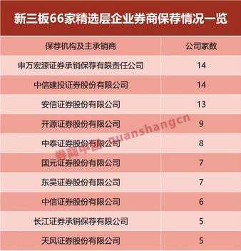 數(shù)據(jù)顯示,截至目前,新三板掛牌企業(yè)7299家,以服務(wù)于要求較高的精選層66家企業(yè)中,前十的券商為:申萬(wàn)宏源(14家)、中信建投(14家)、安信證券(13家)、開(kāi)源證券(9家)、【中泰證券(600918)、股吧】(8家)、國(guó)元證券(7家)、東吳證券(7家)、中信證券(6家)、長(zhǎng)江證券(5家)和天風(fēng)證券(5家)。