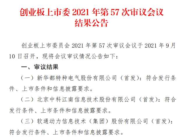 9月10日,創(chuàng)業(yè)板上市委公告,新華都特種電氣股份有限公司、北京中科江南信息技術(shù)股份有限公司、軟通動(dòng)力信息技術(shù)(集團(tuán))股份有限公司首發(fā)獲通過(guò)。