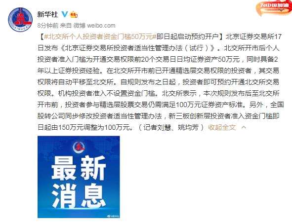 (原標題:北交所個人投資者資金門檻50萬元 即日起啟動預約開戶)