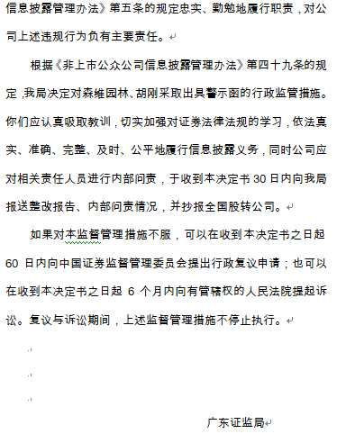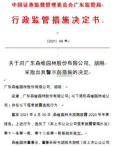 根據(jù)《非上市公眾公司信息披露管理辦法》第四十九條的規(guī)定,廣東證監(jiān)局決定對森維園林、胡剛采取出具警示函的行政監(jiān)管措施。