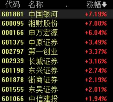 周一盤中,券商股異動(dòng)拉升,中國銀河、【湘財(cái)股份(600095)、股吧】漲超7%,申萬宏源漲超6%,中原證券、第一創(chuàng)業(yè)、長(zhǎng)城證券等紛紛跟漲。