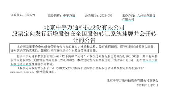 12月30日,新三板創(chuàng)新層公司中宇萬(wàn)通發(fā)布公告稱,公司此前擬定增發(fā)行的120萬(wàn)股股份將于2022年1月5日起在全國(guó)中小企業(yè)股份轉(zhuǎn)讓系統(tǒng)掛牌并公開(kāi)轉(zhuǎn)讓。