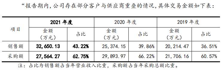 此外,華達股份客戶與供應(yīng)商重合的收入及采購占比較高。報告期內(nèi),公司客戶與供應(yīng)商重合的銷售收入占營業(yè)收入比例分別為36.51%、39.86%、43.22%,采購額占同期采購總額的比例分別為60.57%、66.22%、62.75%。同時,公司招股書與保薦工作報告披露的客戶與供應(yīng)商重合金額及占比存在差異。