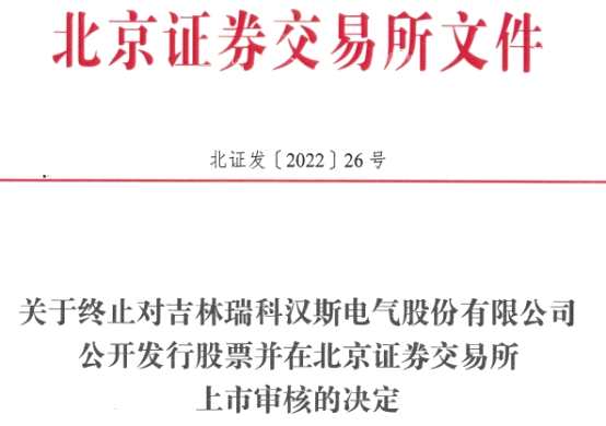 北交所網(wǎng)站昨日消息,北交所決定終止對(duì)吉林瑞科漢斯電氣股份有限公司(以下簡(jiǎn)稱“瑞科漢斯”)公開發(fā)行股票并在北京證券交易所上市審核。