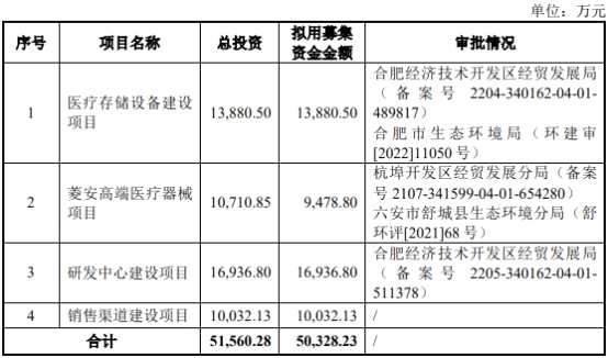 中科美菱本次募集資金扣除發(fā)行費用后的凈額全部用于以下項目:醫(yī)療存儲設(shè)備建設(shè)項目、菱安高端醫(yī)療器械項目、研發(fā)中心建設(shè)項目、銷售渠道建設(shè)項目。