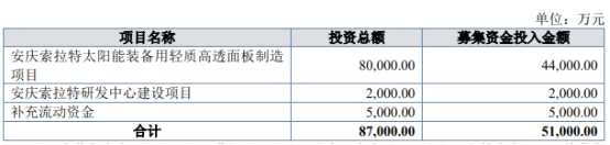 公司原擬募集資金5.10億元,用于安慶索拉特太陽能裝備用輕質高透面板制造項目、安慶索拉特研發(fā)中心建設項目、補充流動資金。
