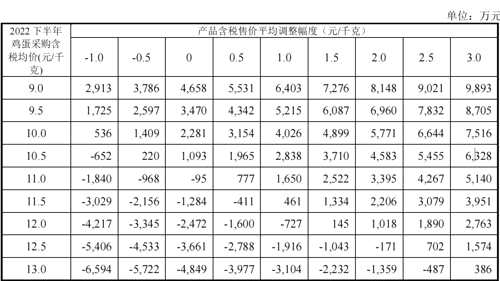 招股書(shū)顯示,歐福蛋業(yè)的主要原料為雞蛋,雞蛋成本占其產(chǎn)品總成本的比重可達(dá)80%左右。據(jù)公司測(cè)算,假設(shè)今年下半年產(chǎn)品售價(jià)與最近3個(gè)月持平,期間費(fèi)用率與上半年持平,產(chǎn)品結(jié)構(gòu)、總體投入產(chǎn)出比與上半年相同,在產(chǎn)品含稅售價(jià)不變的情況下,雞蛋采購(gòu)含稅均價(jià)每上漲0.5元/千克,公司凈利潤(rùn)就會(huì)減少1188萬(wàn)元左右。