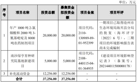 綠亨科技2022年11月24日披露的招股書顯示,公司擬募集資金37,256.00萬元,用于“年產(chǎn)1000噸2-氯煙酸和2000噸3-氰基吡啶及8000噸農(nóng)藥制劑項(xiàng)目”、“南沙綠亨育種研究院基地新建項(xiàng)目”、“補(bǔ)充流動(dòng)資金”。