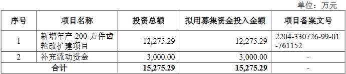 豐安股份2022年12月1日披露的招股說明書顯示,其擬募集資金15,275.29萬元,擬分別用于新增年產(chǎn)200萬件齒輪改擴(kuò)建項目和補(bǔ)充流動資金。