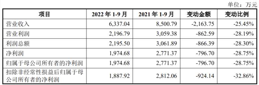 2022年1-9月,公司實現(xiàn)營業(yè)收入6337.04萬元,同比下降25.45%;凈利潤/歸屬于母公司所有者的凈利潤1974.68萬元,同比下降28.75%;歸屬于母公司所有者的扣非凈利潤為1887.92萬元,同比下降32.86%;經(jīng)營活動產(chǎn)生的現(xiàn)金流量凈額為1274.26萬元,同比增加268.10%。