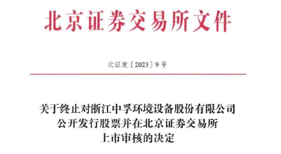 2023年1月30日,中孚環(huán)境向北交所提交了《浙江中孚環(huán)境設(shè)備股份有限公司關(guān)于撤回向不特定合格投資者公開發(fā)行股票并在北京證券交易所上市申請文件的申請》。根據(jù)《北京證券交易所向不特定合格投資者公開發(fā)行股票并上市審核規(guī)則(試行)》第五十三條的有關(guān)規(guī)定,北交所決定終止對中孚環(huán)境公開發(fā)行股票并在北京證券交易所上市的審核。