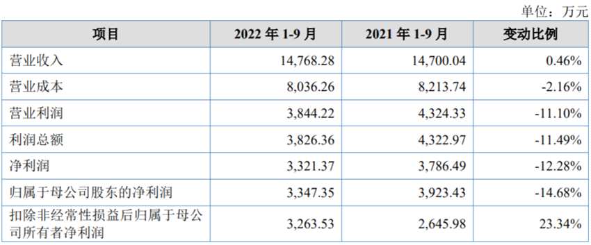 2022年1-9月,公司營業(yè)收入為14,768.28萬元,較上年同期增長(zhǎng)0.46%;凈利潤(rùn)為3,321.37萬元,較上年同期下降12.28%;歸屬于母公司股東凈利潤(rùn)為3,347.35萬元,較上年同期下降14.68%;扣除非經(jīng)常性損益后的歸屬于母公司股東凈利潤(rùn)為3,263.53萬元,較上年同期增長(zhǎng)23.34%。
