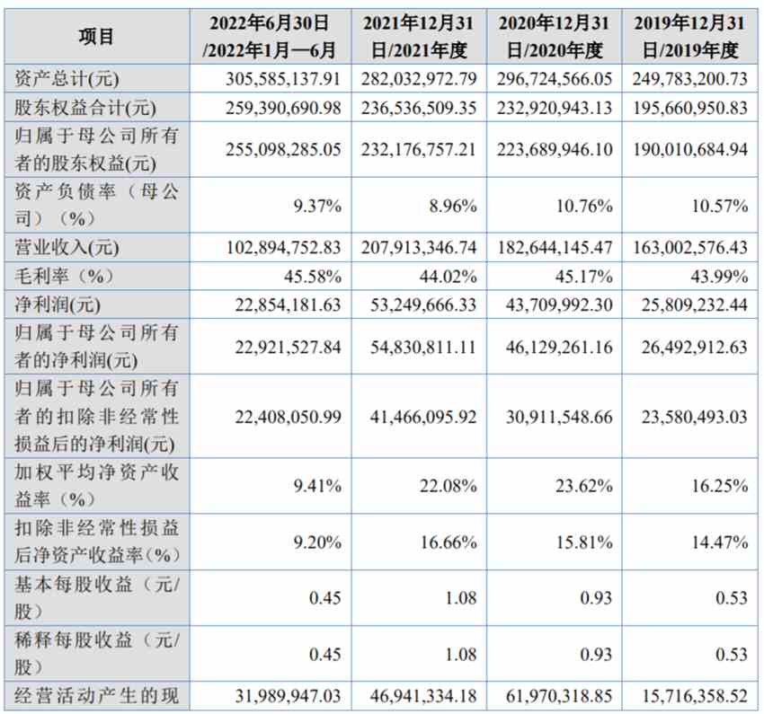 2019年至2022年1-6月,新贛江的營業(yè)收入分別為16,300.26萬元、18,264.41萬元、20,791.33萬元和10,289.48萬元;凈利潤(rùn)分別為2,580.92萬元、4,371.00萬元、5,324.97萬元和2,285.42萬元;歸屬于母公司所有者的凈利潤(rùn)分別為2,649.29萬元、4,612.93萬元、5,483.08萬元和2,292.15萬元;歸屬于母公司所有者的扣非凈利潤(rùn)分別為2,358.05萬元、3,091.15萬元、4,146.61萬元和2,240.81萬元;經(jīng)營活動(dòng)產(chǎn)生的現(xiàn)金流量?jī)纛~分別為1,571.64萬元、6,197.03萬元、4,694.13萬元和3,198.99萬元。