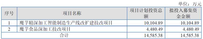 一致魔芋2023年1月30日披露的招股說(shuō)明書顯示,公司擬募集資金14,585.38萬(wàn)元,用于魔芋精深加工智能制造生產(chǎn)線改擴(kuò)建技改項(xiàng)目、魔芋食品深加工技改項(xiàng)目。