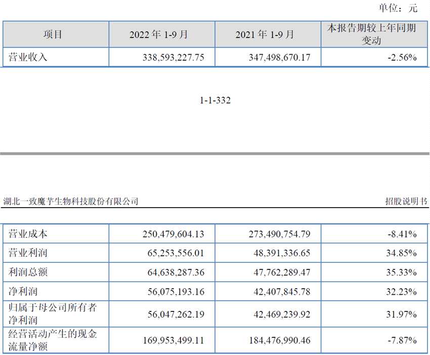 2022年1-9月,一致魔芋的營(yíng)業(yè)收入33,859.32萬(wàn)元,同比下降2.56%;凈利潤(rùn)5,607.52萬(wàn)元,同比增長(zhǎng)32.23%;歸屬于母公司所有者的凈利潤(rùn)5,604.73萬(wàn)元,同比增長(zhǎng)31.97%;經(jīng)營(yíng)活動(dòng)產(chǎn)生的現(xiàn)金流量?jī)纛~16,995.35萬(wàn)元,同比下降7.87%。
