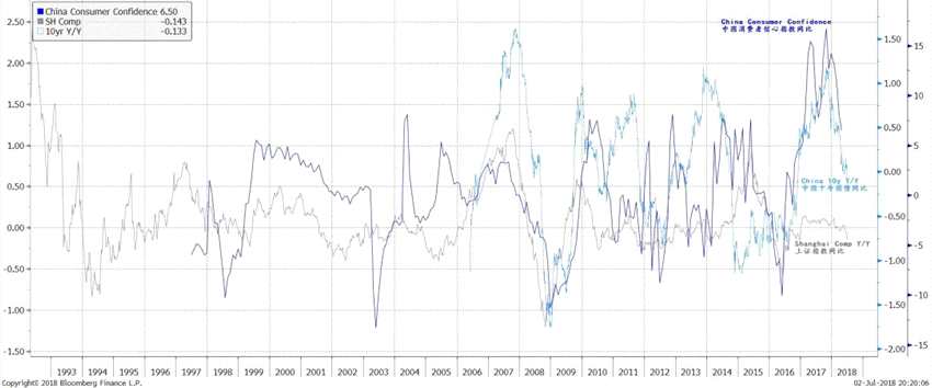 圖表二:中國消費(fèi)者信心從歷史高位快速回落,預(yù)示著債券收益率和股票下行的壓力。