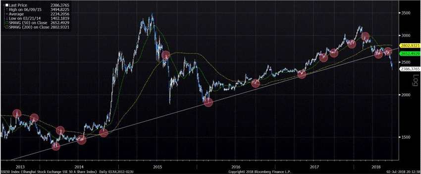 上證的上行趨勢已被明顯破壞。在共識的一片“抄底”之聲中,上證跌破了2017年12月我們預(yù)測的交易區(qū)間下限2800點(請參閱《2018年展望:無限風(fēng)光》,20171204)。更令人驚訝的是,曾被稱為中國的“漂亮50”的藍(lán)籌股指數(shù) - 上證50指數(shù),已經(jīng)明顯打破了自2014年中觸底以來的上升趨勢,并且牢牢地“死叉”于200日移動均線以下(圖表一)。