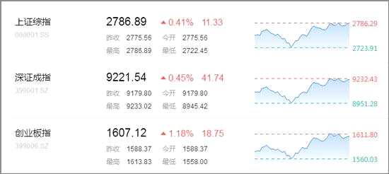 A股今日上演V型反轉(zhuǎn)好戲,早盤A股全線走低,滬指盤中最低跌至2722.45點(diǎn),跌幅接近2%;午后市場,創(chuàng)業(yè)板率先上漲。截止收盤,滬指報(bào)2786.89點(diǎn),漲0.41%,深成指報(bào)9221.54點(diǎn),漲0.45%,創(chuàng)業(yè)板報(bào)1607.12點(diǎn),漲1.18%。