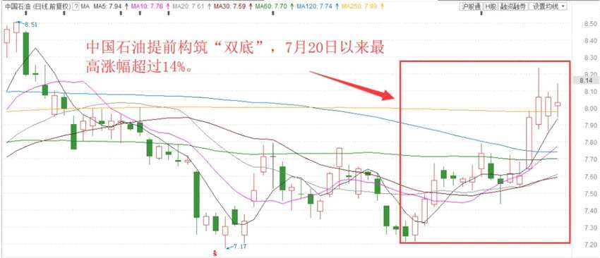 其次,A股的“巨無霸”角色借助消息面利好強(qiáng)力穩(wěn)定大盤。大家也許注意到了,大盤從7月底開始的一波下跌之中,【中國石油(601857)、股吧】以及石油石化類個股始終起著穩(wěn)定市場和護(hù)盤的作用。從其日K線圖上來看,中國石油其實在7月19日就提前走出了“雙底”形態(tài),之后持續(xù)拉升,更是在周二大漲逾4%,周三在大盤回落的時候仍然收漲近2%。從7月19日以來,期間中國石油的最高漲幅超過了14%,而同期大盤處于下跌。可想而知,如果沒有中國石油以及石油石化類個股的強(qiáng)力護(hù)盤,滬指跌破前期低點2691.02點的可能性幾乎是100%的。