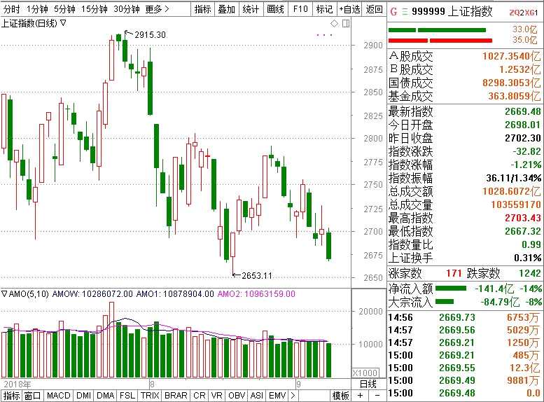截止收盤,滬指收?qǐng)?bào)2669.48點(diǎn),跌幅1.21%;深成指收?qǐng)?bào)8158.49點(diǎn),跌幅1.97%;中小板指收?qǐng)?bào)5564.24點(diǎn),跌幅2.63%;創(chuàng)業(yè)板指報(bào)1390.82點(diǎn),跌幅2.41%。
