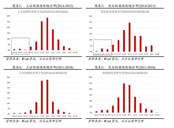 我們統(tǒng)計(jì)了2014/07/23~2015/06/24這輪牛市,對于上證綜指和創(chuàng)業(yè)板指,都存在股民常說的“牛市多長陰”的現(xiàn)象,這從數(shù)學(xué)上說并不矛盾。牛市中指數(shù)收益率的分布會發(fā)生變化,數(shù)據(jù)整體右移,均值和中位數(shù)上升。同時(shí)方差變大,尾部風(fēng)險(xiǎn)加劇,特別是左邊的尾部風(fēng)險(xiǎn),從下圖中可以明顯發(fā)現(xiàn)牛市和一般行情下收益率分布的差別。