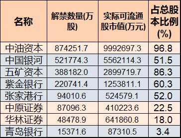 引人注意的是,明年1月份,有8只金融股也迎來(lái)解禁,包括五礦資本、紫金銀行(601860)、張家港行(002839)、【中國(guó)銀河(601881)、股吧】(601881)、中原證券(601375)、華林證券(002945)、青島銀行(002948)、中油資本。其中,中油資本的解禁比例最高,達(dá)96.8%。