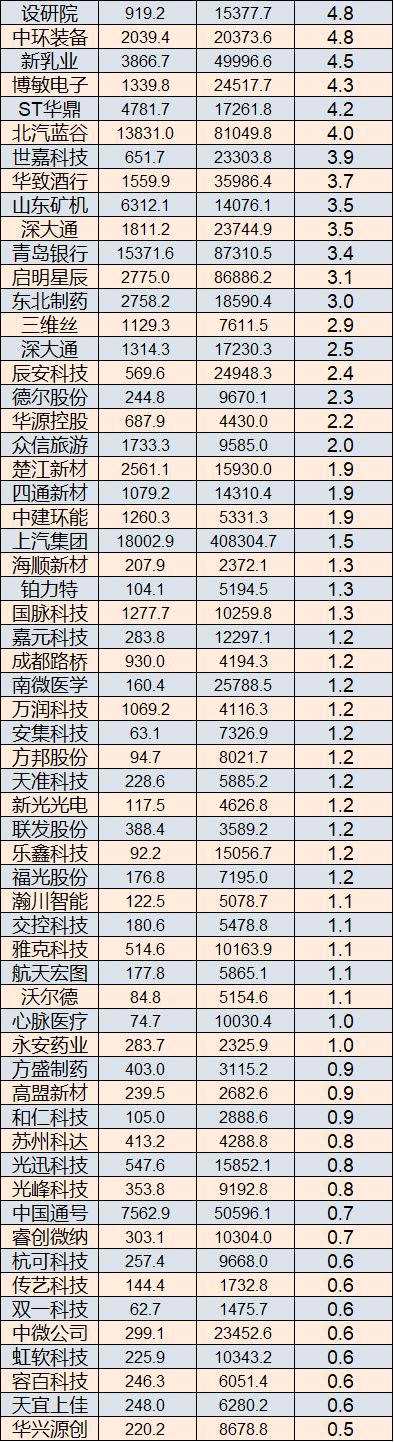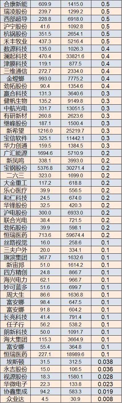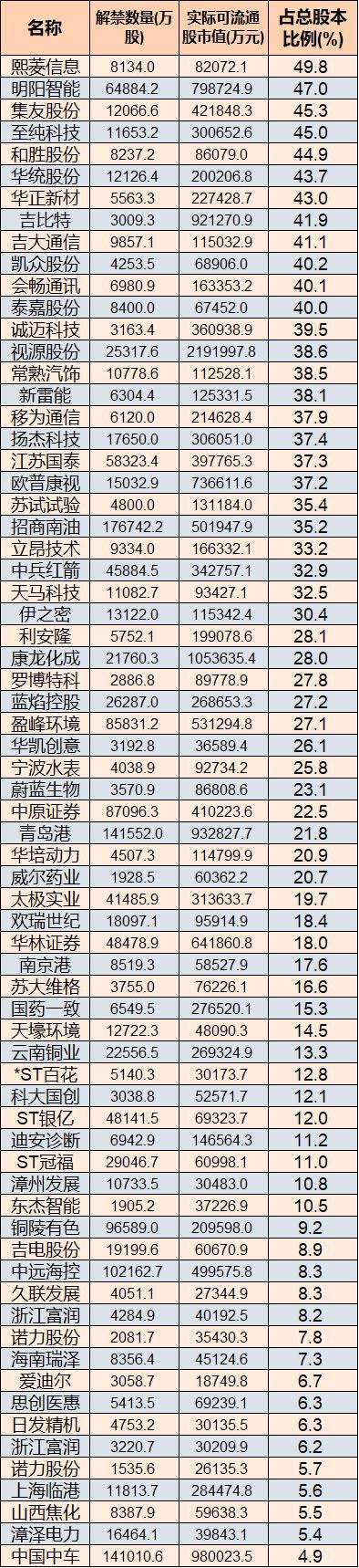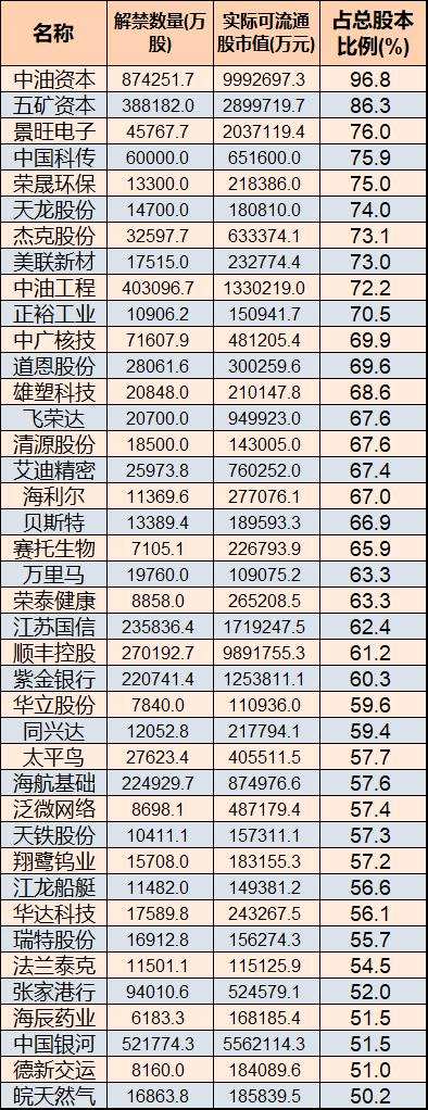 引人注意的是,有40只個(gè)股的解禁股占總股本的比例超過(guò)50%。其中,中油資本(000617)、五礦資本(600390)、景旺電子(603228)、中國(guó)科傳(601858)、榮晟環(huán)保(603165)、天龍股份(603266)、杰克股份(603337)、美聯(lián)新材(300586)、中油工程(600339)、【正裕工業(yè)(603089)、股吧】(603089)等個(gè)股解禁股占總股本的比例超過(guò)70%。詳見下表: